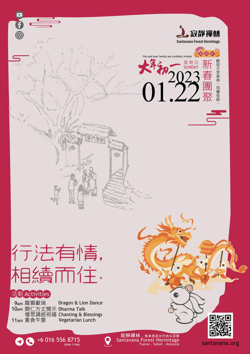 (亚庇二日讯)2023年华人农新年大年初一落在2023年1月22日,位于斗亚兰区的寂静禅林,将于当天举办2023年癸卯年新春团聚,欢迎大眾举家踊跃光临,共渡新春佳节!