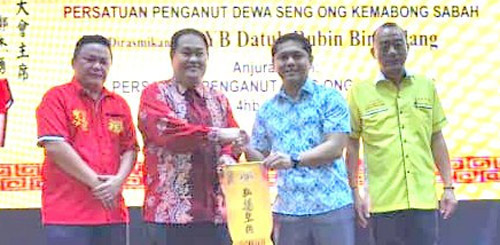 欢迎宴主礼嘉宾拿督鲁宾巴朗之代表李端鲁宾,沙巴州圣王公暨大伯公圣诞巡游联合总会总会长杨文吉,大会主席郑杰勇,筹委会主席张国强,致赠锦旗,以感谢沙巴道联之支持。