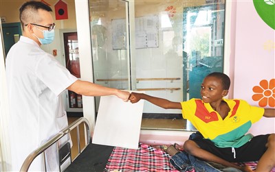 在塞内加尔迪亚姆尼亚久儿童医院,中国第19批援塞内加尔医疗队内科医生郭良华与患儿碰拳示意。