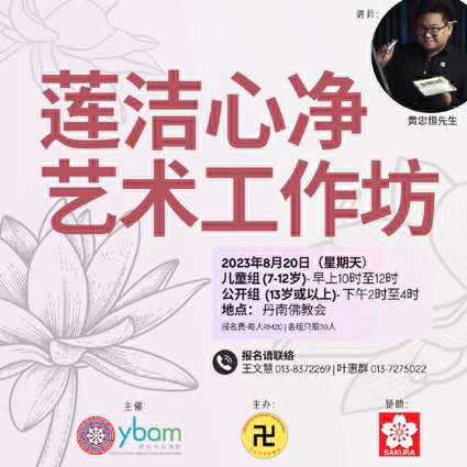 (丹南19日讯)由马佛青沙闽州联委会主催,丹南佛教会主办的“莲洁心净艺术工作坊”将于8月20日(星期日)在丹南佛教会举行。