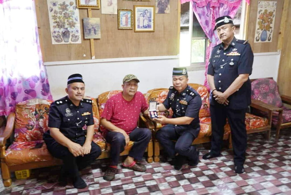 (根地咬26日讯)根地咬警察局局长延皮尔·加莱率领多位警官亲自拜访一位退休警官格雷戈里·利奥,并代表国家颁发“国家英雄功勋獎章”,表扬他在过去为国家及社区所做出的贡献。