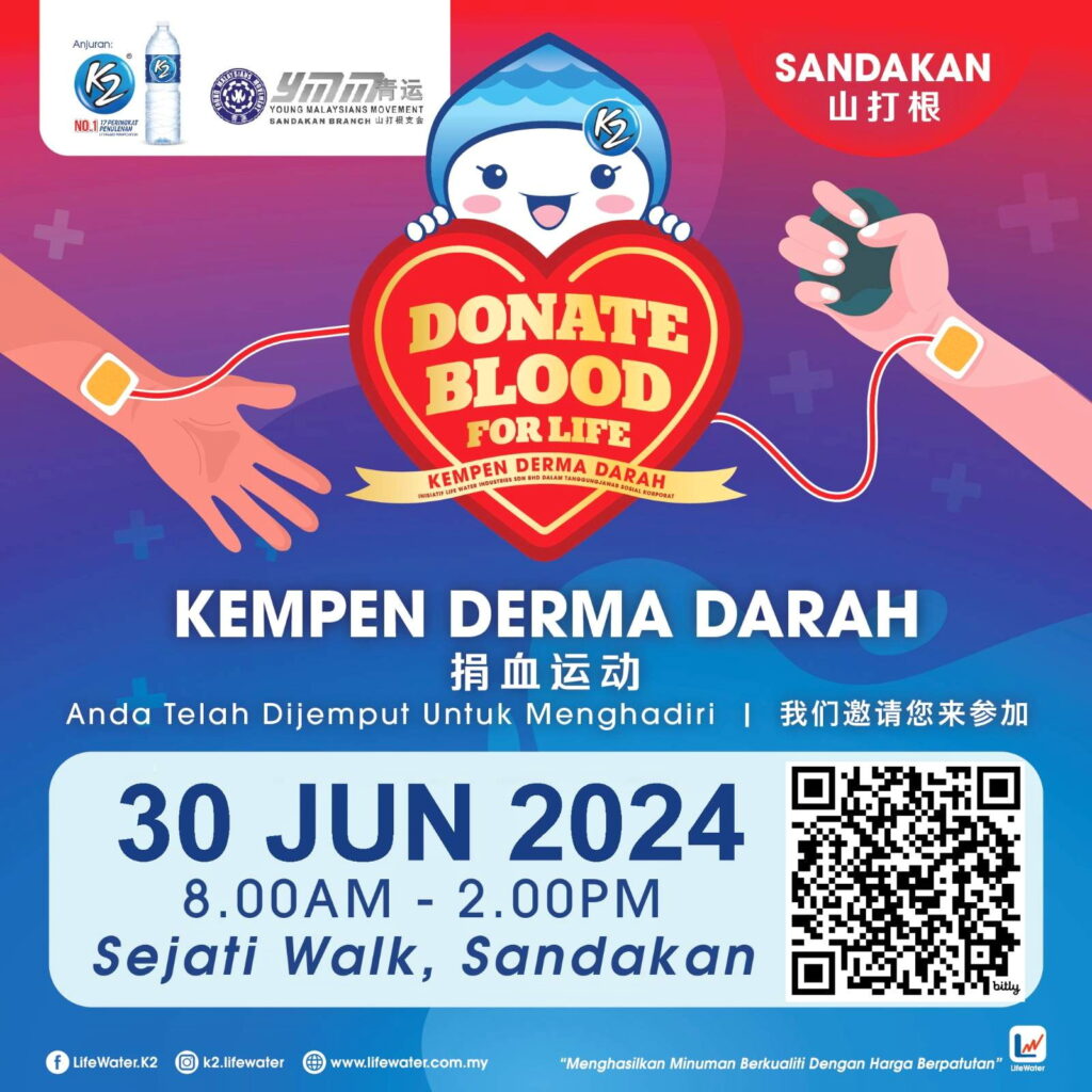 (本报山打根五日讯)生命泉源有限公司(K2 Life Water)与青运山打根支会,将于本(6)月30(星期日)早上8d时至下午2时,于北路七哩Sejati Walk主进口大堂,举办 “捐血一滴,救助生命” 爱心公益捐血运动,欢迎大众踊跃再来一起到来参与捐血活动。