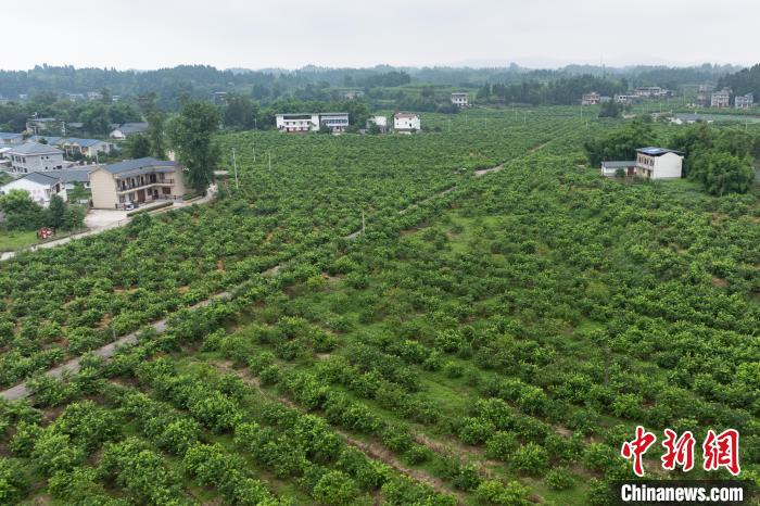 7月8日,航拍重庆潼南柏梓镇小岭村柠檬基地。当日,“行走中国·海外华文媒体川渝行”参访团一行走进重庆市潼南区,实地了解当地柠檬产业发展。据悉,重庆潼南是世界三大柠檬产地之一,柠檬种植面积达32万亩,柠檬鲜果及柠檬产品远销俄罗斯、新加坡、东南亚等30多个国家和地区。近年来,“潼南柠檬”从技术研发、种苗培育、标准化种植、精深加工等为一体的柠檬全产业链在当地日臻完善。(无人机照片)中新社记者 何蓬磊 摄