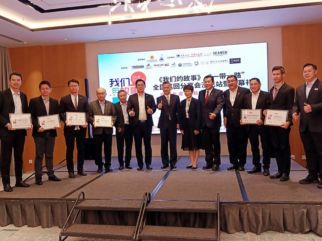 郑学方公使颁发感謝状后与拿督馮晋哲代表黃学秦、拿督陈伟裕及梁志华等合影。