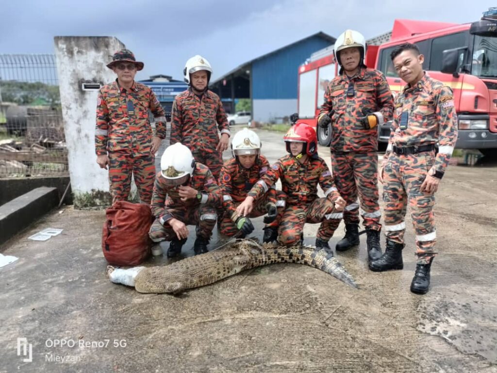 CROCODILE CAPTURED IN SANDAKAN … firemen from the Sandakan Fire and Rescue Station captured a two-metre-long crocodile from a drain in front of a supermarket at Jalan Seguntor on Tuesday. Nine personnel were despatched to the scene situated 13 km from the Sandakan Fire and Rescue Station upon being notified at 9.37 am after the public spotted the reptile in the drain. The firemen arrived at 9.52 am and caught the crocodile in less than 15 minutes. They removed the reptile from the drain and handed it to the Wildlife Department for further action. A handful of workers in the vicinity gathered at a safe distance to watch the firemen capture the crocodile. The operation ended at 10.07 am with no untoward incident reported. Pic shows Sandakan firemen with the captured crocodile on Tuesday. – James Leong