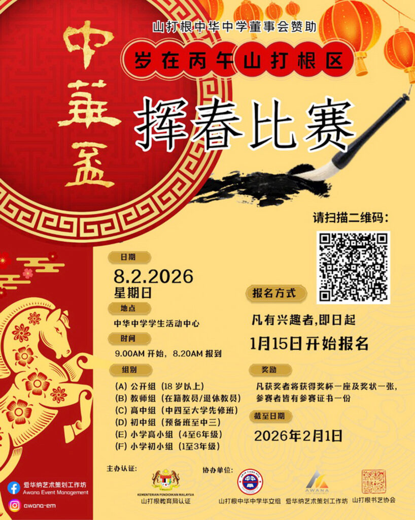 今年的“岁在丙午山打根区中华杯挥春比赛”依然是由中华中学华文组、山打根书艺协会、爱华纳艺术策划工作坊,携手联合主办。