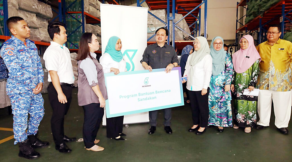 来自国家石油公司、沙巴电力公司、BTC集团、哈山尼集团以及沙米玛书局与文具公司的代表在亚庇的森布兰福利局,移交有关物资予山打根市议会主席拿督华特肯森代表接收。