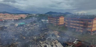 (斗湖二日訊)斗湖甘榜吉丁岸今早发生火患,大火將40间違章屋烧毁, 所幸並無任何傷亡報告發生,起火原因及財物損失有待調查。